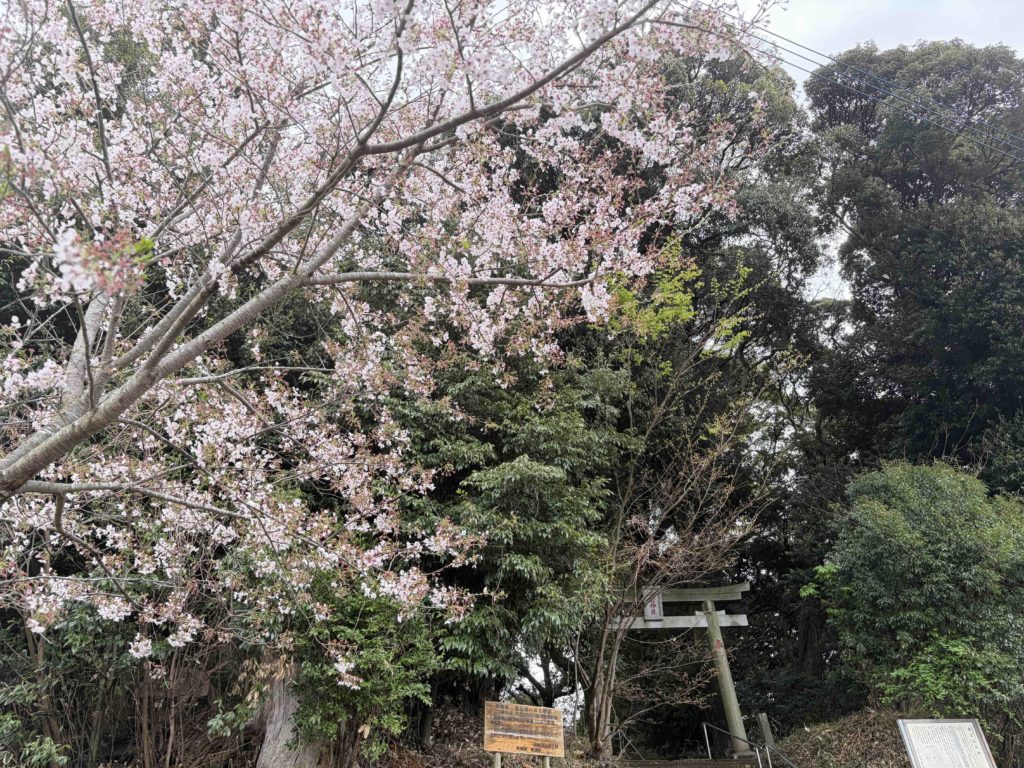 御本殿の手前に大きな桜の木があり、